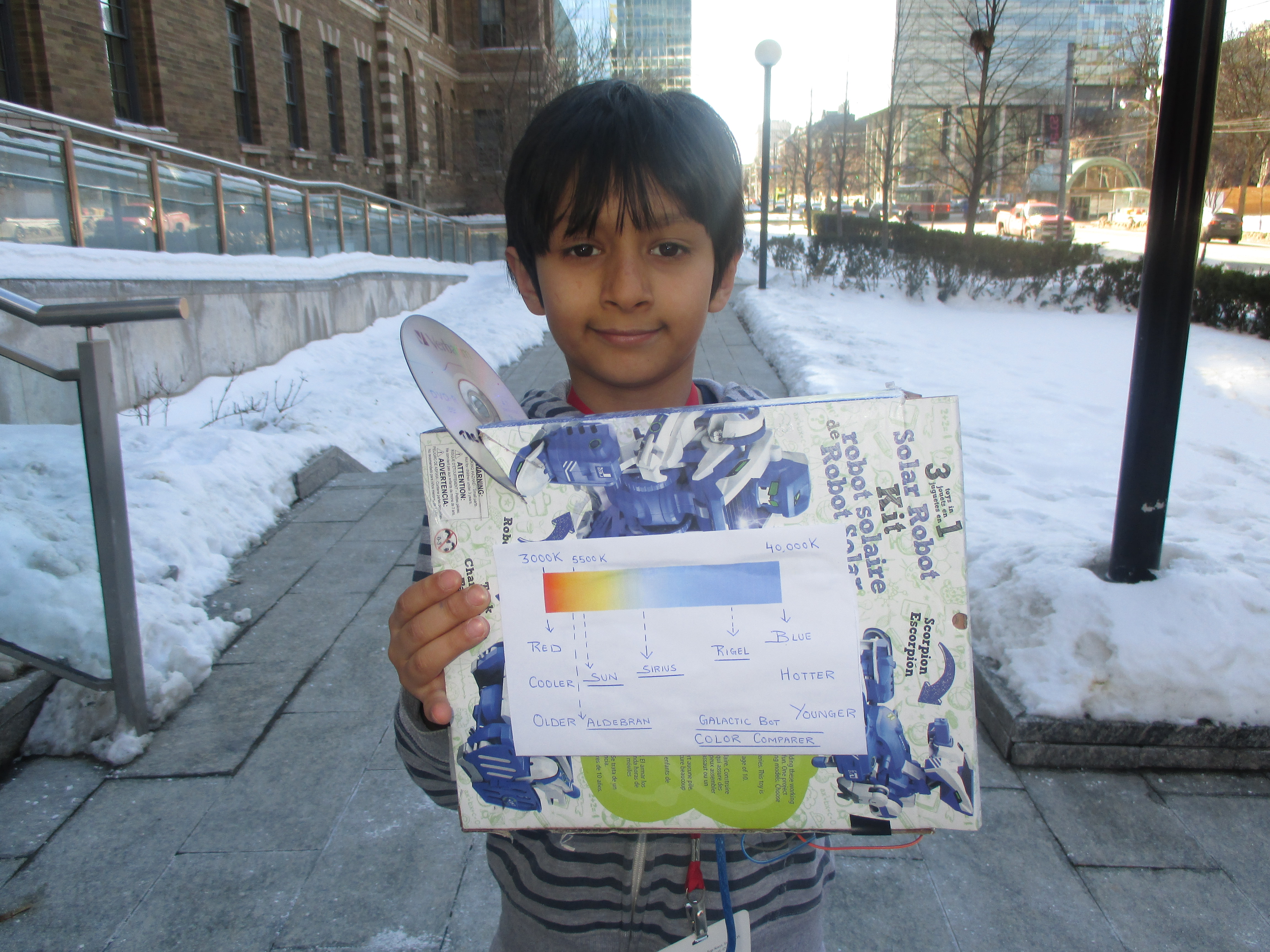 We dreamt of having a simple instrument for children to learn about stars. We planned, we sketched, we though it over, and the idea of GalacticBot was born. GalacticBot is made of Arduino, Cardboard Box, CD-Rom and sensors. It is able to get spectrum of bright objects, get Red, Blue and Green color composition of objects, and allows kids to do a color match with the stars. The color match allows them to determine, if the star