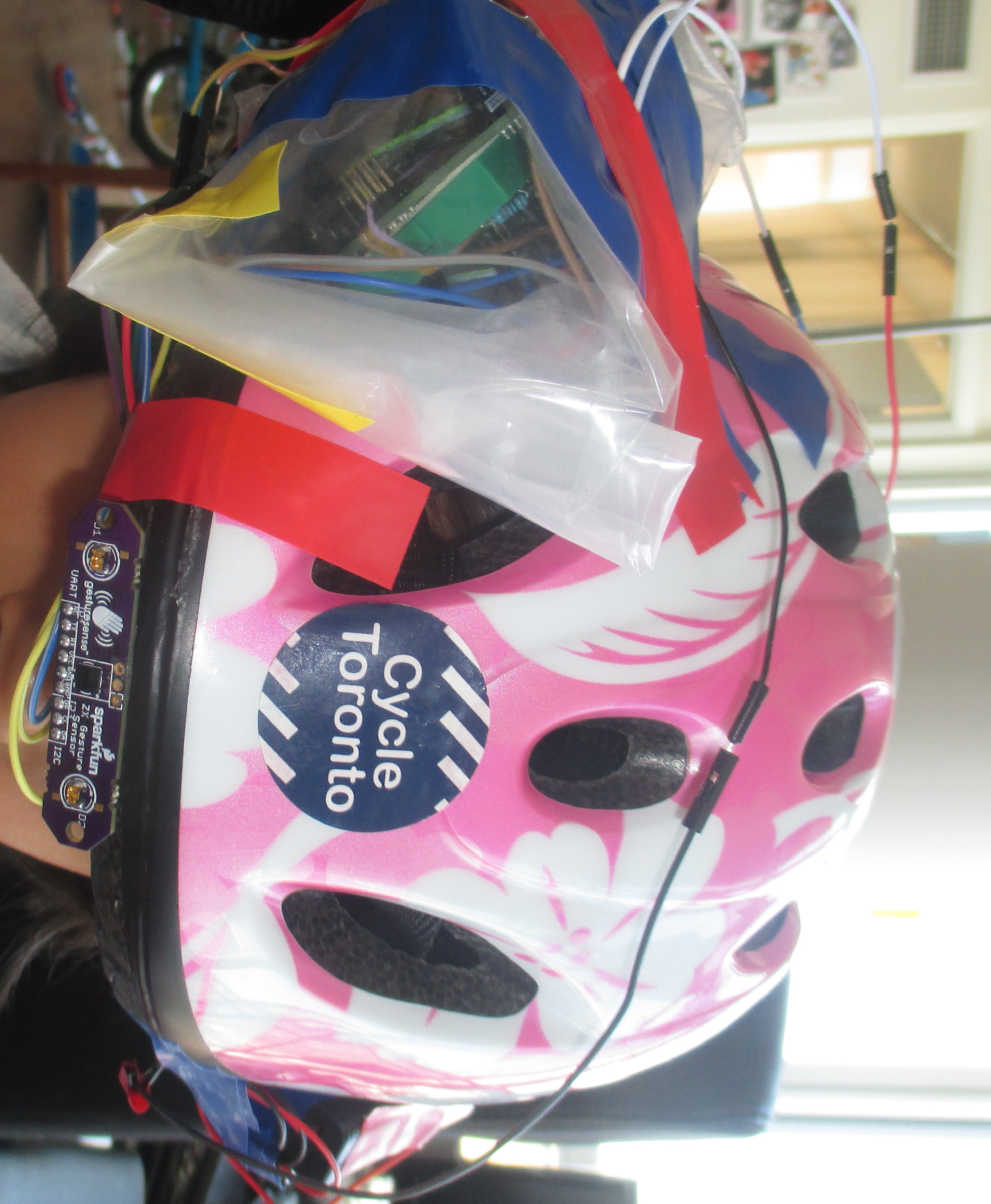 The Cycling season is on! To help kids safely cycle in the cities we created a Gesture Sensing Helmet during the Hack’n’Talk 2015 held at the Ryerson Fashion Zone from 1-3 May 2015.