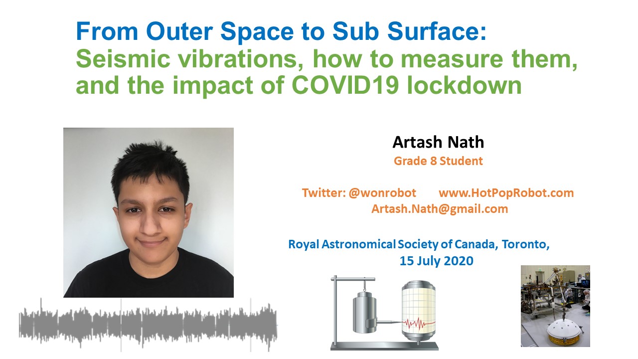 On July 15, 2020, Artash Nath gave a presentation on Seismic Vibrations, their role in astronomy, how to measure them, and on what impact the COVID-19 lockdown has had on these vibrations. The presentation was delivered by Artash at the online Recreational Astronomy Night meeting of the RASC, Toronto Centre, Canada.