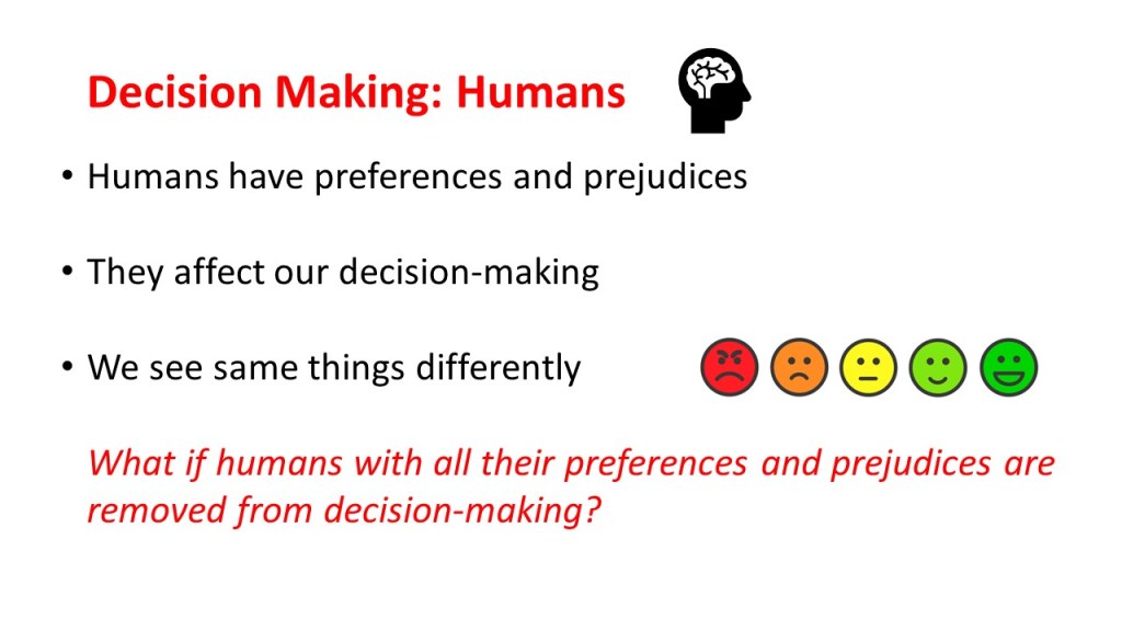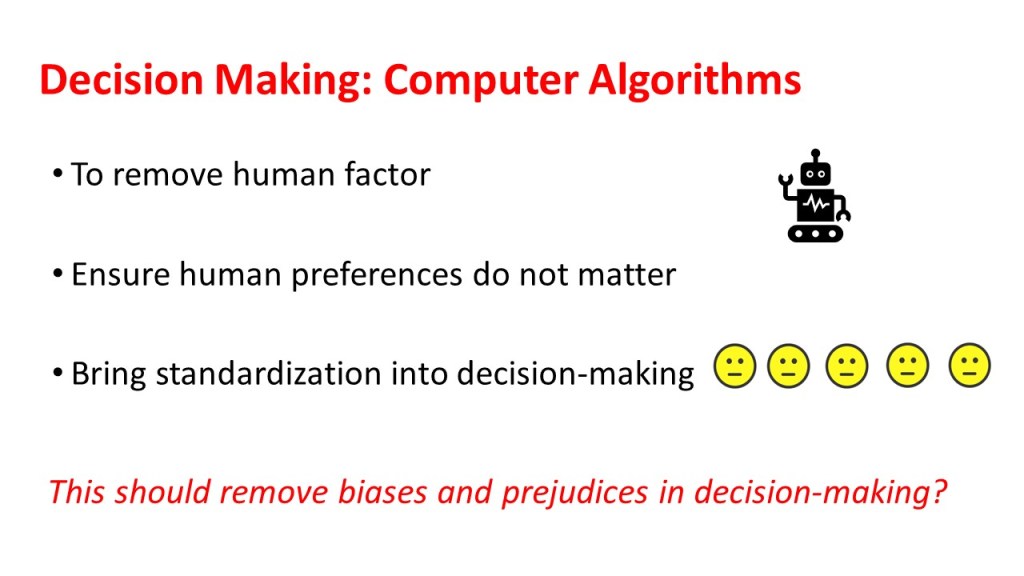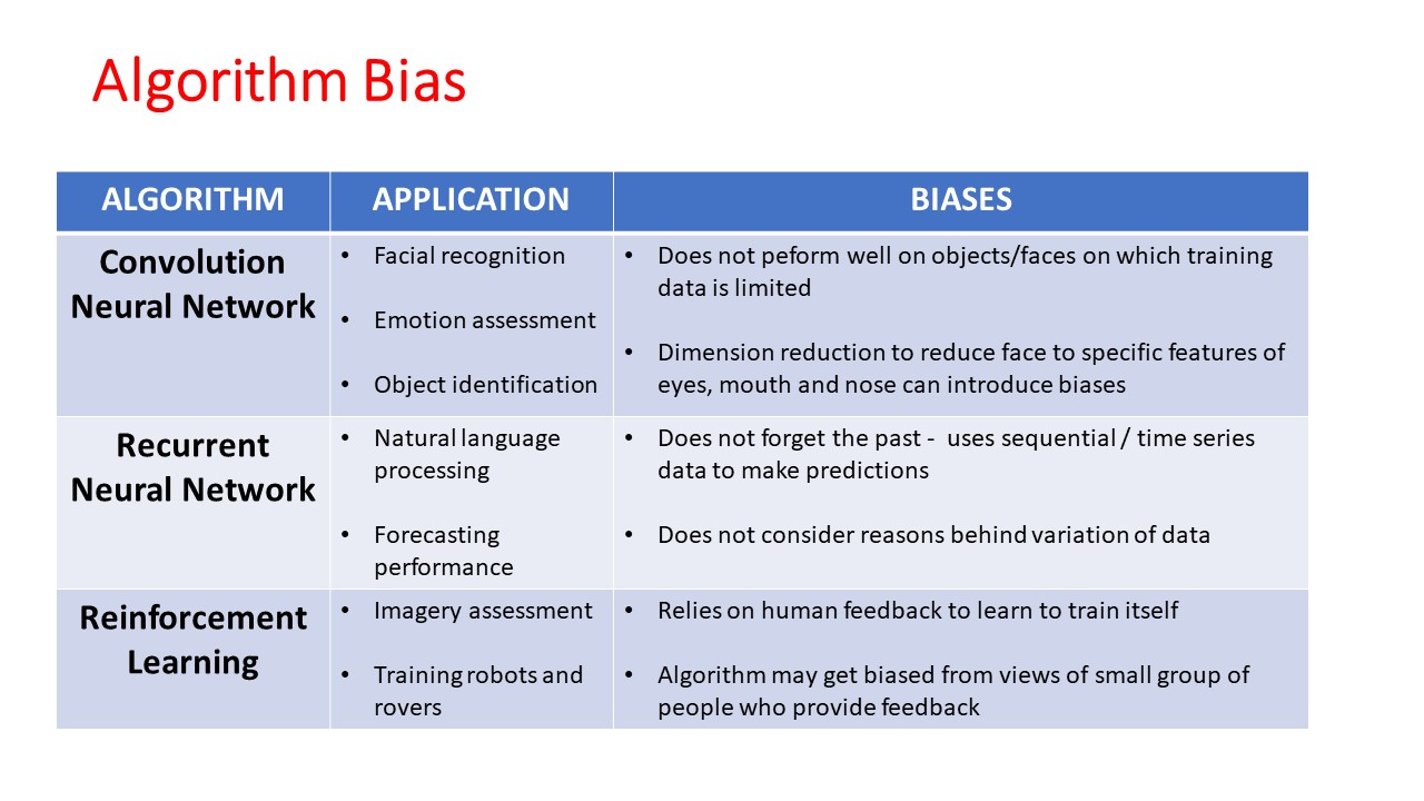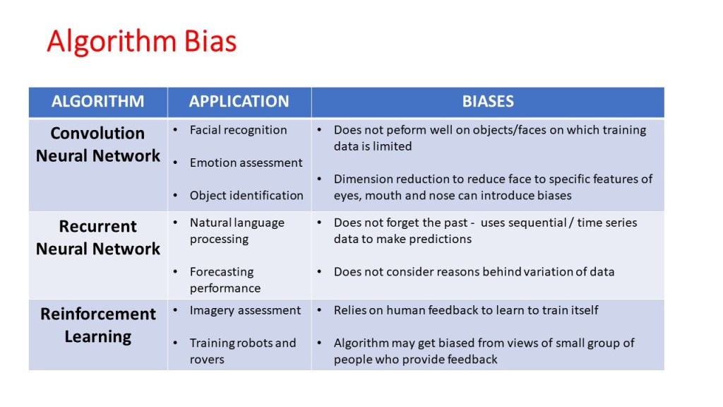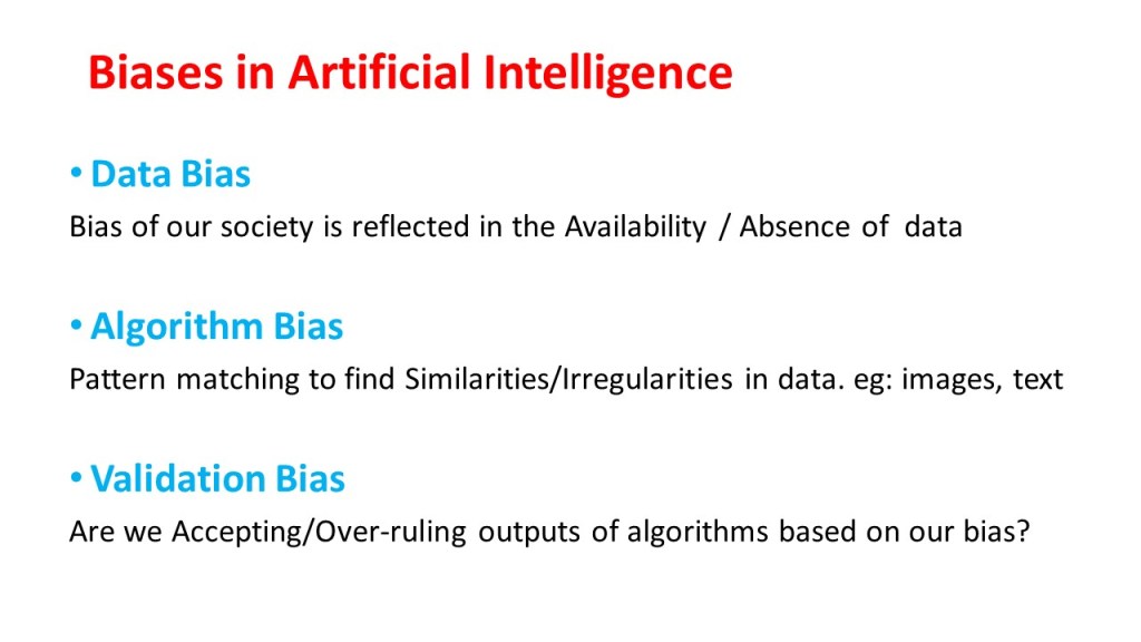 Algorithmic biases are like black boxes. They are so deeply rooted, require technical knowledge of algorithms, and an understanding of what information is collected, synthesized, and used for training the algorithms, that very few people are able to correlate unfairness meted out to them to biases in algorithms. With the growing use of robotics and artificial intelligence in all aspects of our lives, we have to find innovative ways to tackle the algorithmic biases – may be using the algorithms themselves to identify and declare the biases in them.