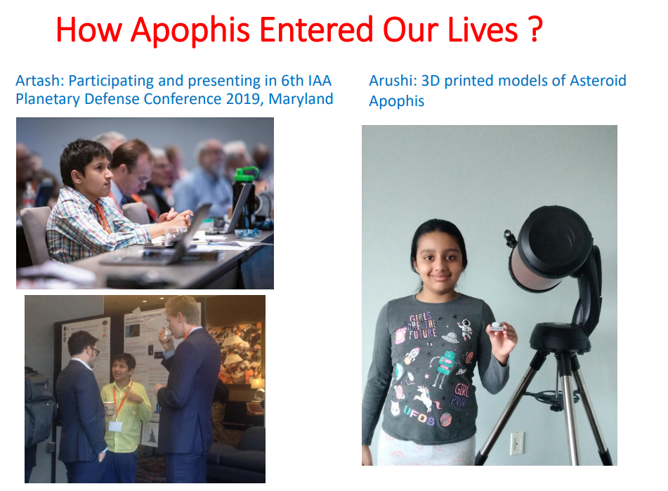 During this conference, he heard about asteroid Apophis. NASA had deemed Apophis (discovered in 2004) to be one of the most dangerous asteroids to Earth after its discovery in 2004. Close calls in 2029 and 2036 were predicted and later ruled out. Artash also came back with a 3D printed model of the possible shape of asteriod Apophis. In March 2021, NASA dismissed the threat based on new data and Apophis was removed from the list of dangerous asteroids. However the information and mystery of the asteroid Apophis remained in our minds.