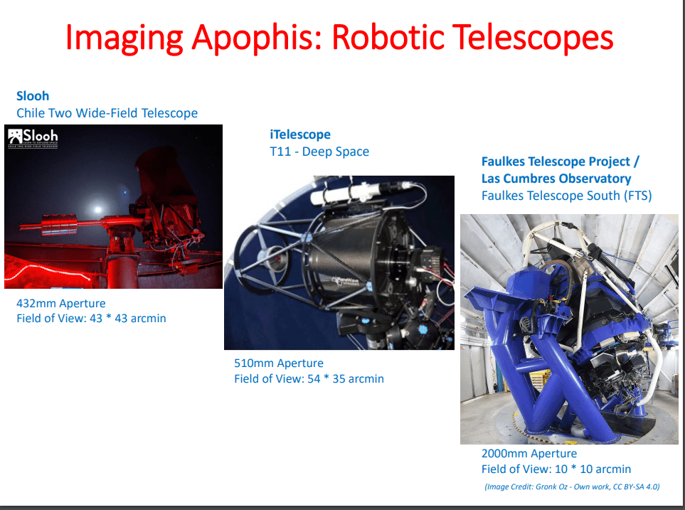 We ended up using a mix of telescopes for our project and successfully captured Asteroid Apophis. These telescopes ranged from aperture sizes of 40cms to 2 meters. It allowed us to become more ambitious with our plans and the asteroids we wanted to image. A big thanks to all the observatories who gave us time on their telescopes and answered our questions.
