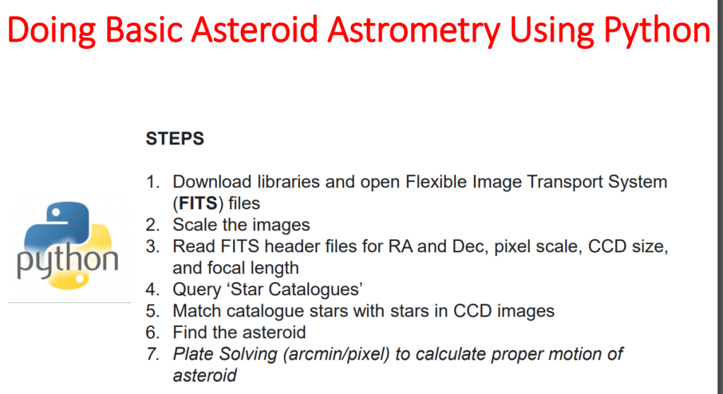 We had previous experience of using Astrometrica software for asteroids detection using data from their Pan-STARRS1 telescope. This meant we knew about the movements of asteroids, and how they would appear in a series of photographs taken over a time interval in the same field of view. Asteroids would appear moving in a straight line while the distant background stars would remain fixed. The process however would be different if the field of view changed.