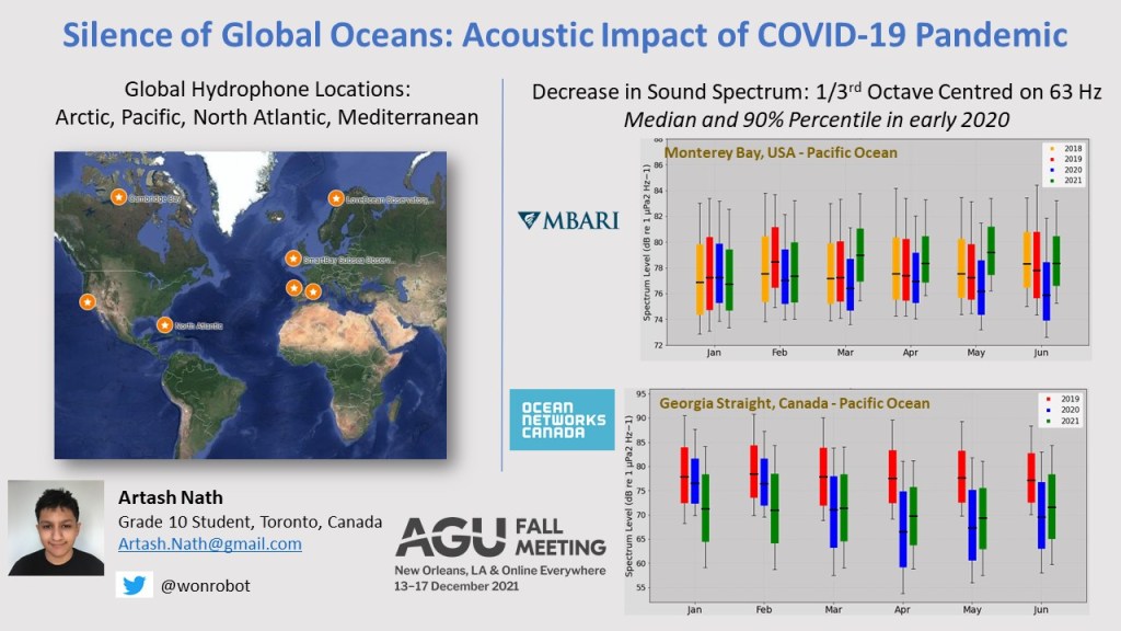 This year, AGU 2021 is being held from 13 – 17 December 2021 at New Orleans, Los Angeles and virtually. Motivated by the fun and learnings from my previous research on impact of COVID-19 lockdowns on seismic vibrations in Canadian cities (see the webapp: http://www.MonitorMyLockdown.com which showcases my research) I decided to expand my research to global oceans and showcase the research plans and preliminary findings at the AGU 2021.