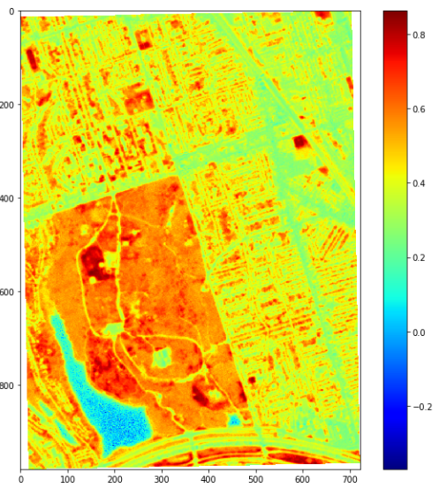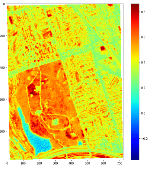 NDVI index calculated for High Park using Satellite Imagery from Planet Labs. Red area means the highest vegetation index, and blue means a lower vegetation index.