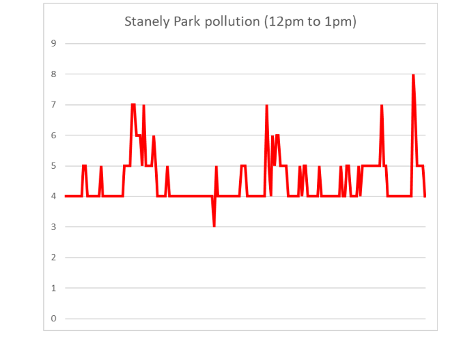Pollution readings coming from my pollution sensor at Stanely Park