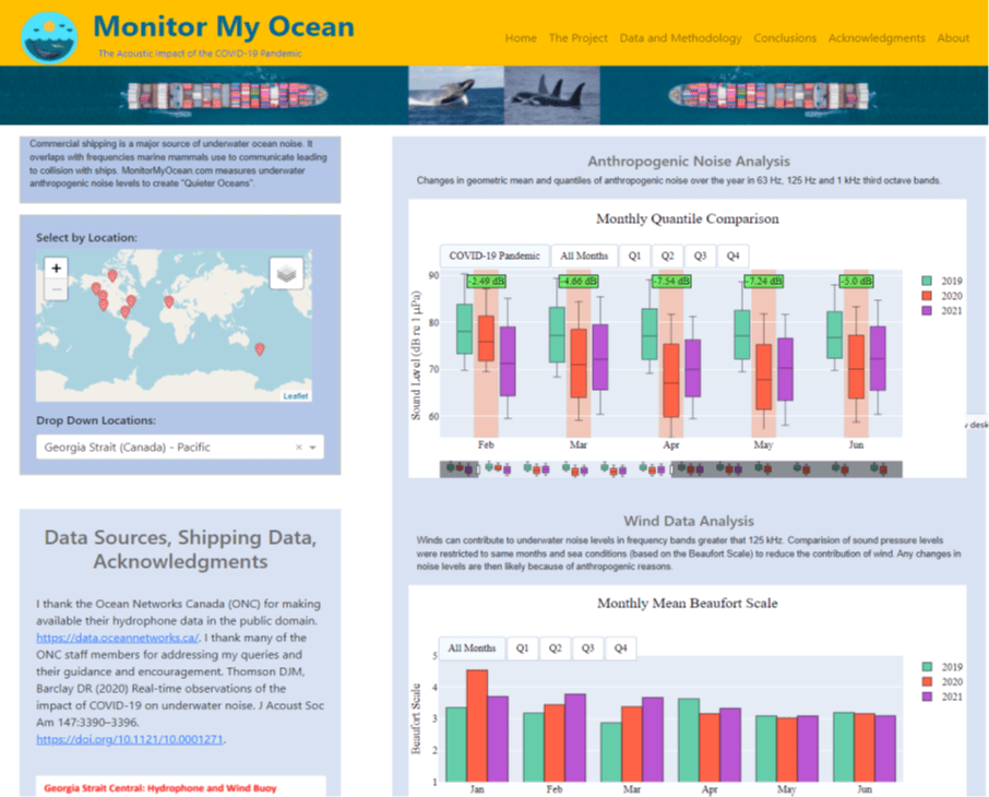 The study proved that strategic “anthropauses” could reduce underwater noise levels and give marine mammals a chance to reverse the decline in their population. A web application https://wwwMonitorMyOcean.com was created to provide updated anthropogenic noise levels in global oceans. Policymakers can determine if measures such as shifting shipping channels or moratoriums on new shipping routes lead to “Quieter Oceans.”