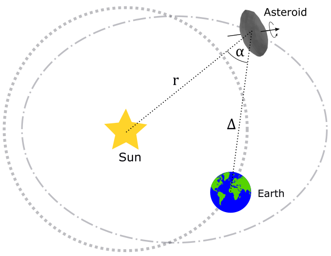 Asteroids orbit around the Sun. As they do not have their own light, we see them because of sunlight reflected from their surface. The phase angle is the angle between the Sun, the asteroid, and the observer. The asteroid would appear the brightest when phase angle is zero and its apparent brightness decreases as phase angle increases.