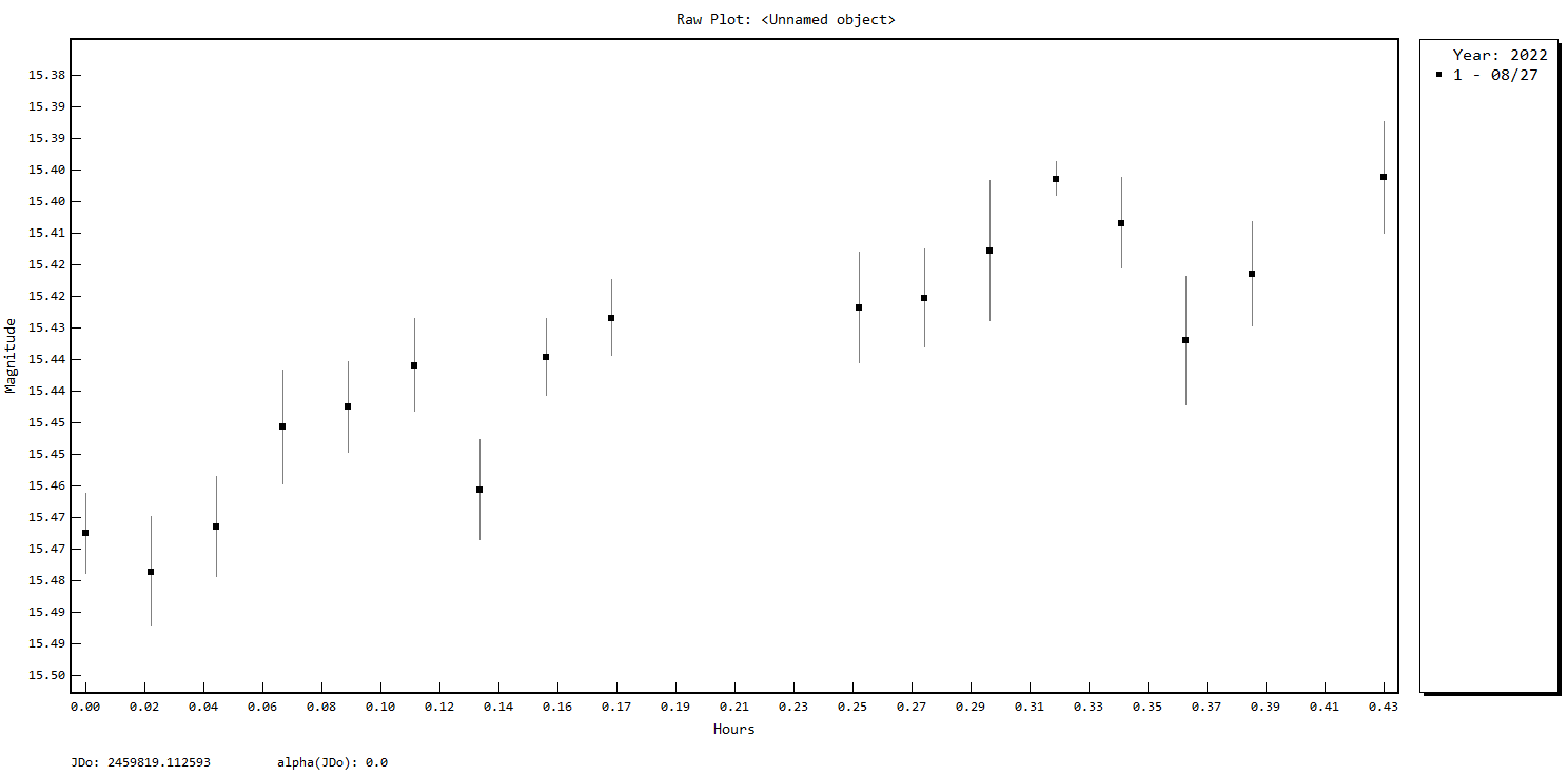 Based on differential photometry, the light curve of asteroid based on 20 observations on 28 August 2022 has been graphed below: