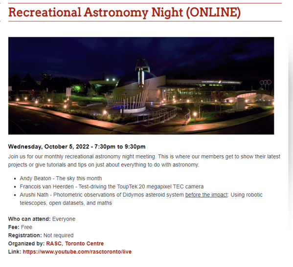 The presentation, “Photometric observations of Didymos asteroid system before the impact: Using robotic telescopes, open datasets, and maths” would cover observations taken prior to 26 September 2022. Everyone is welcome to view the presentation live online at: https://www.youtube.com/rasctoronto/live interact with speakers and ask questions. It will also be recorded and become available for later viewing.