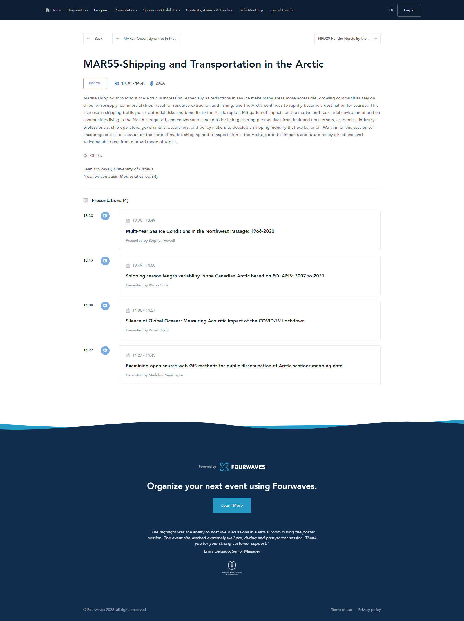 My talk was scheduled on 8 December 2022 in the MAR55-Shipping and Transportation in the Arctic session (13:30 – 14:45). The session aimed to encourage critical discussion on the state of marine shipping and transportation in the Arctic, potential impacts and future policy directions. It was co-chaired by Jean Holloway, University of Ottawa and Nicolien van Luijk, Memorial University.