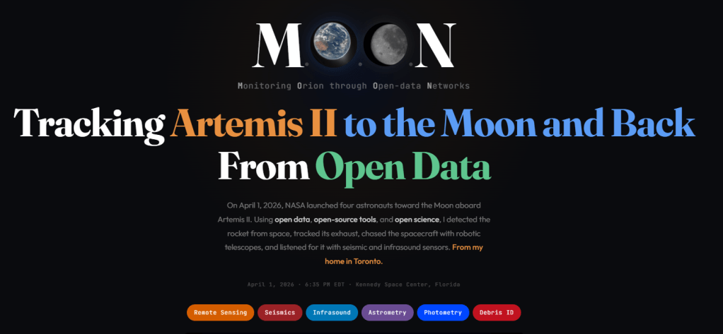 On April 1, NASA launched four astronauts toward the Moon aboard Artemis II, including Canadian astronaut Jeremy Hansen, the first Canadian to leave low Earth orbit. I have been using open science and open data to track the spacecraft every night since, its launch at the Kennedy Space Centre from my home in Toronto using satellite imagery, robotic telescopes, and data from seismic and infrasound arrays.