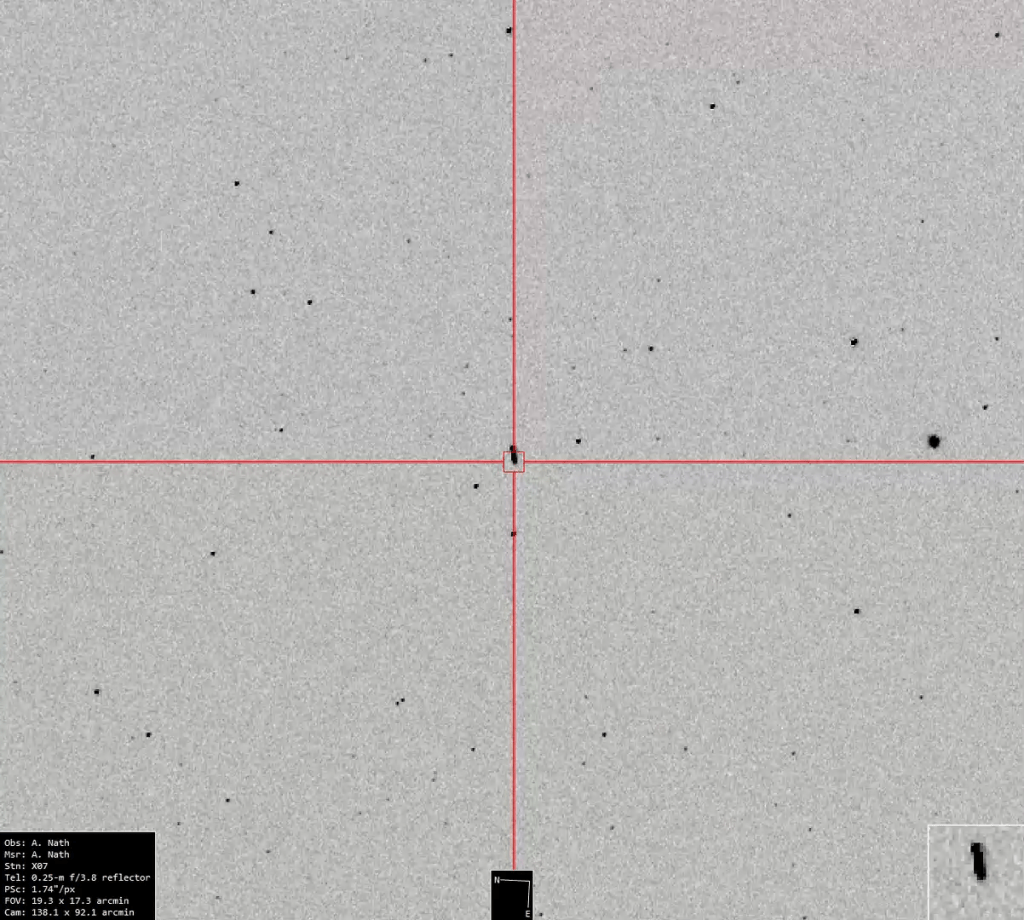 In the same 1° field of view, I spotted a streaking object. I measured 11 CCD positions, submitted an ADES astrometric report to Project Pluto, and it was matched to NORAD 20356 a discarded rocket body from 1989, orbiting at 22,605 km. My measured motion matched the computed trajectory almost exactly.