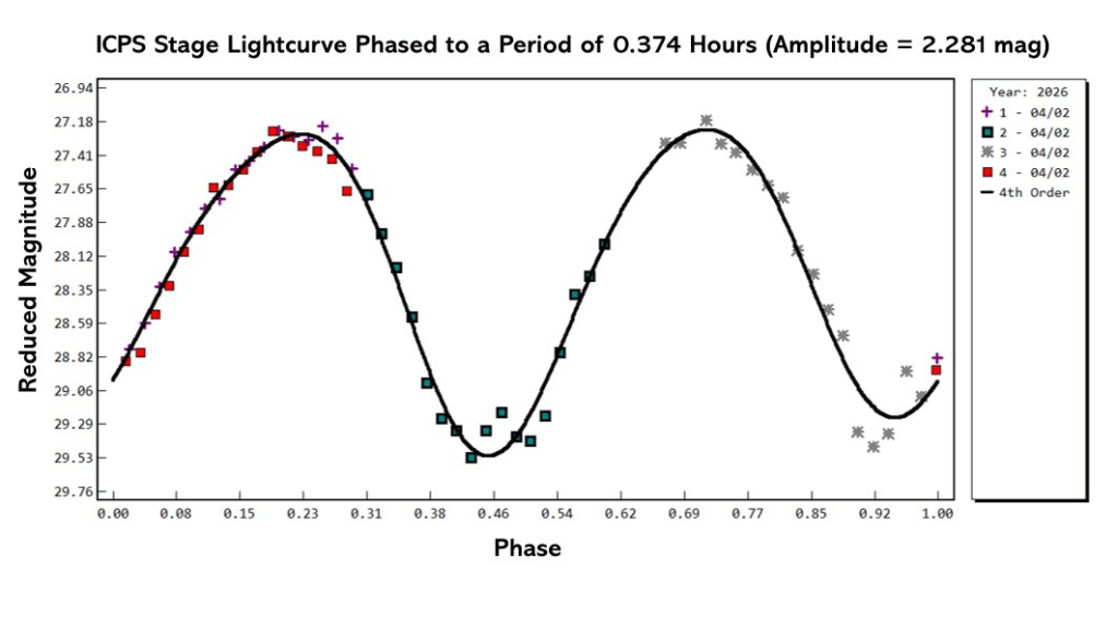 From the T75 light curves, I determined the ICPS upper stage rotation period at 0.376 hours (22.6 minutes). The phased light curve shows a clean double-peaked profile consistent with a tumbling cylinder catching sunlight from two faces per rotation.
