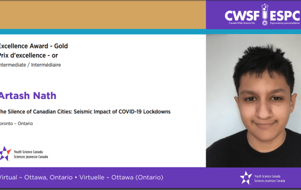 Artash Nath I am pleased that my year-long project: The Silence of Canadian Cities: Seismic Impact of COVID-19 Lockdowns won the Gold Medal at the 2021 Canada Wide Science Fair […]